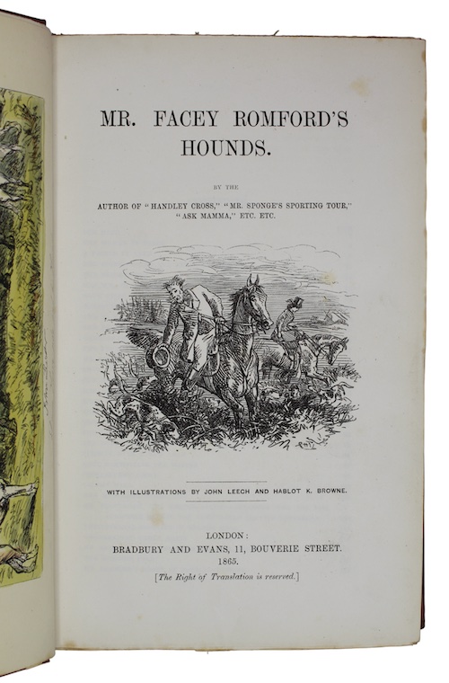 A remarkably well-preserved first edition, in the original cloth, of novelist and sporting writer Robert Smith Surtees' (1805-1864) final work. Neither Surtees nor illustrator John Leech (1817-1864) would live to see the book through press; Halbot Knight Browne (1815-1882), better known by his pseudonym 'Phiz', completed the illustrations.