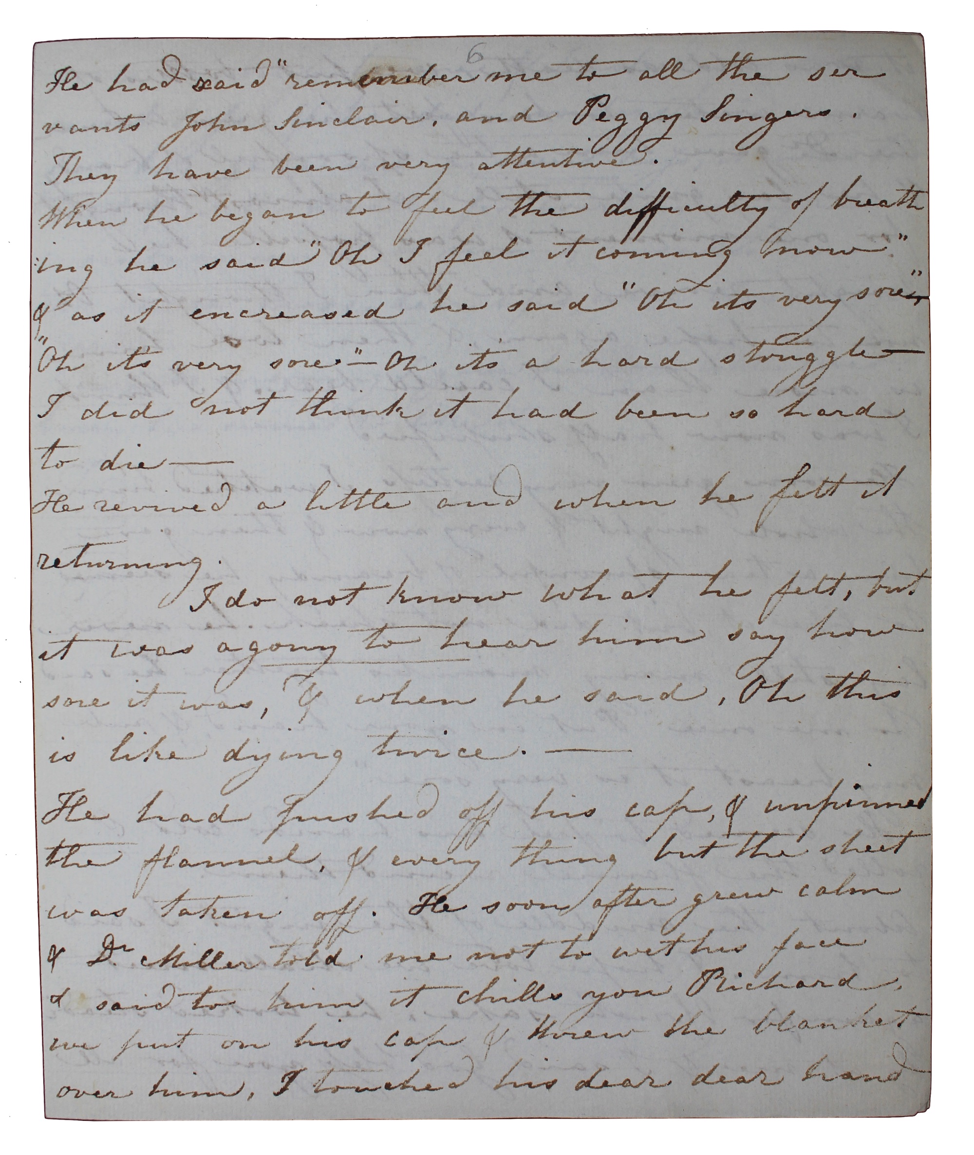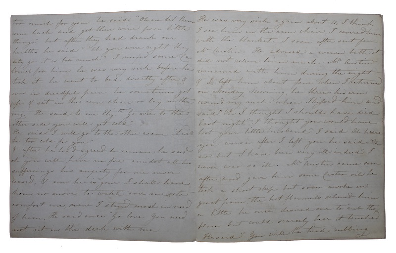 A well-preserved manuscript in the hand of a woman, Elizabeth, providing an account of her husband Richard's final days some four months after his passing. Elizabeth, clearly traumatised by the experience, recounts in great detail the efforts of the doctors to comfort her partner in the throws of his unidentified terminal illness. She passionately records his parting words to their four children, his mother, and brother, concluding with their last hours together alone and his dying remarks: 'I did no think it had been so hard to die. - It's a hard struggle. Oh I wish it was over. - he revived for a short time & when he felt the difficulty of breathing returning he said. Oh this is like dying twice.' It would appear (particularly given the repetition in the manuscript of the above quote and the absence of subsequent dates beyond the first provided), that rather than being an immediate account of events, Elizabeth later recorded her recollections in one sitting for posterity, or indeed as an act of processing her grief.