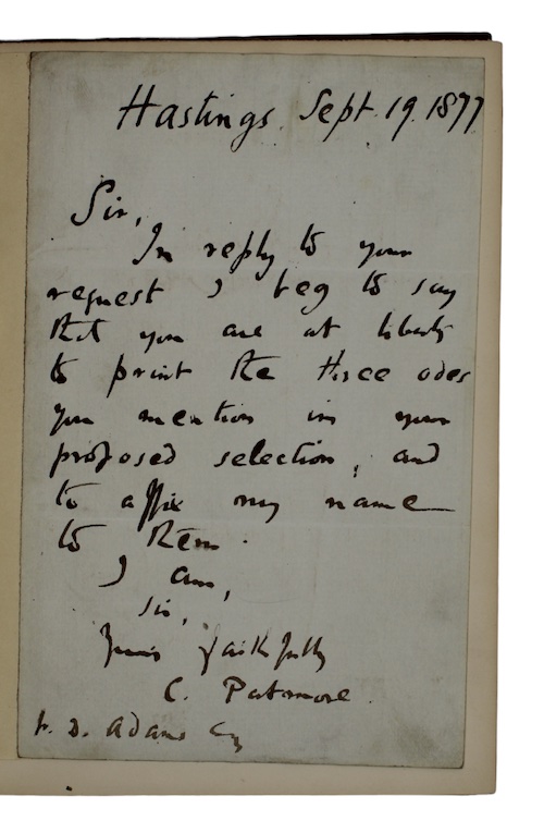 x, 128, ix pp, [1]. With a half-title. Original publisher's brown cloth, printed paper lettering -piece to spine. Extremities worn and sunned, spine panel attached at upper joint only. Armorial bookplate of Anthony Eden to FEP, ink ownership inscription of Richard Garnett to head of title, occasional light marginal spotting. With a one-page ALS tipped-in to front blank fly leaf: 'Hastings Sept. 19, 1877. Sir, In reply to your request I beg to say that you are at liberty to print the three odes you mention in your proposed selection, and to affix my name to them, I am, Sir, Yours faithfully, C. Patmore.' The letter's recipient ('Mr D. Adams'), whose identity we have been unable to establish, is added at the foot of the letter.