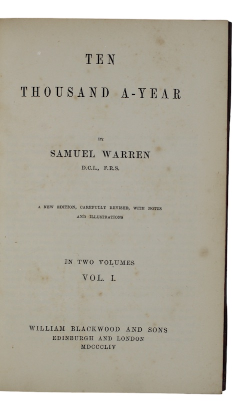 A revised edition of British barrister Samuel Warren's (1807-1877) second novel, initially serialised in Blackwood's Magazine from 1839 to 1841. An immediate best-seller, the novel was one of the earliest narratives concerned with the legal system, and is said to have influenced Dickens, who appears to have borrowed numerous images and ideas, particularly for Bleak House (1852-53). In spite of the negative reaction of Edgar Allan Poe, who called in 'shamefully ill-written' (Graham's Magazine, November, 1841), the book was a sensational commercial success, with new print runs and updated editions published regularly to the turn of the century.