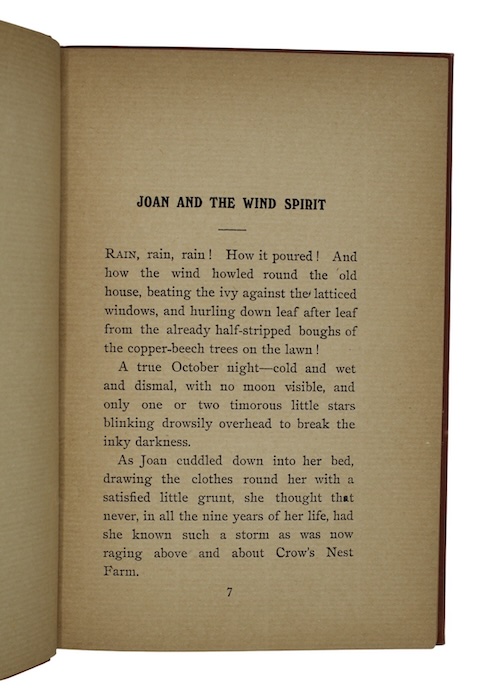The title story, subtitled within the text 'Or How Benny went to Cloudland, and what happened to him there', is an imaginative and evocative account of trip to the Clouds by young Benny White. Given this is a presentation copy, one assumes the title was later changed to Joan and the Wind Spirit, the first of the 13 tales within the volume. We have been unable to trace any other copies with this title in the usual databases, worldwide.