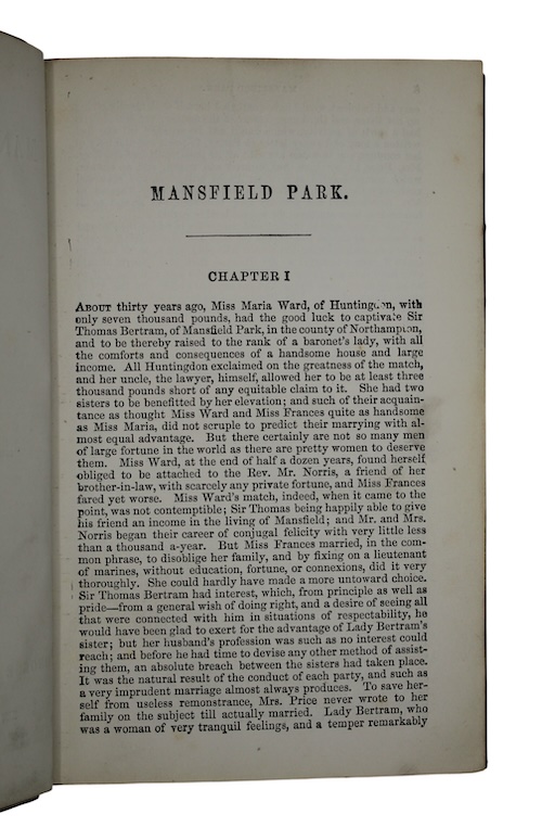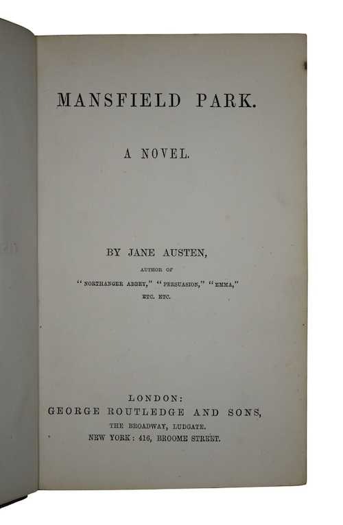 The narrative concerns the coming-of-age of the heroine, Fanny Price, who is thrust into the world of her wealthy aunt, uncle, and their intriguing, duplicitous associates. Gilson notes, despite the absence of a date, that this edition was issued in February 1876, 'according to ECB'. Issued as part of Routledge's 'Ruby Series', it is a reprint of their edition of 1857 with a new title page.