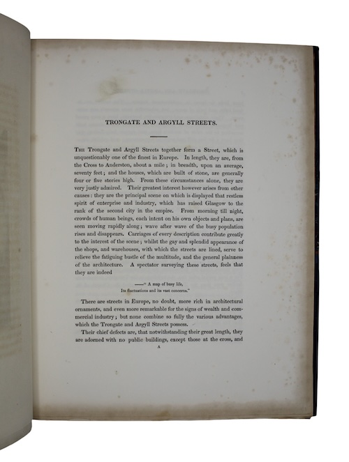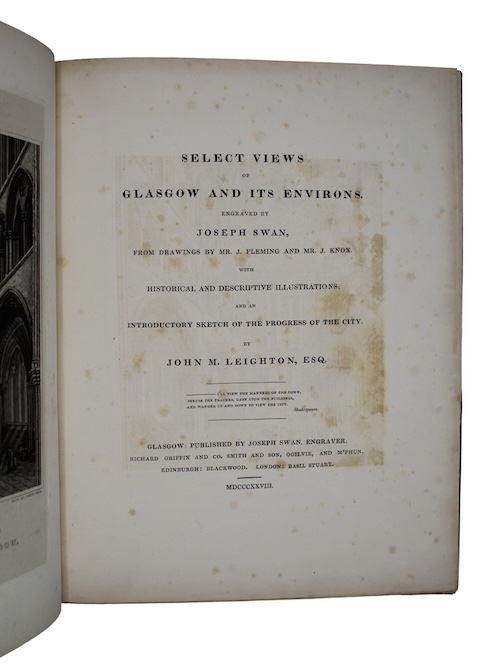 The first edition, finely bound by Ramage, of the first known collaboration between Scottish travel writer and topographer John M. Leighton and noted Glaswegian engraver Joseph Swan (1796-1872), richly furnished with the drawings of local painter John Fleming (1792-1845). The success of this volume motivated the three to continue producing topographical works, beginning with Select Views on the Clyde (1830) and concluding with their best-known collaboration, Select Views of the Lakes of Scotland, in 1834.
