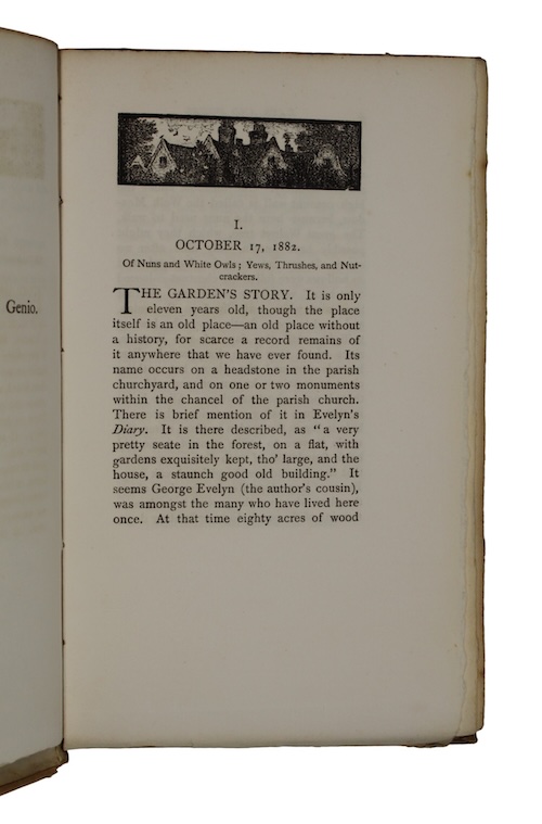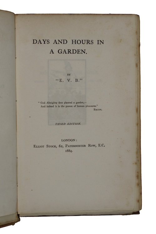 One of 50 large paper copies of the third edition of Scottish artist Eleanor Vere Boyle's (1825 – 1916) Days and Hours in a Garden, one of four garden-books written by the author in the last years of her life. Boyle, who often published work under the pseudonym 'EVB' to obscure her aristocratic background, first came to prominence for her intricate watercolour illustrations, which had strong Pre-Raphaelite influence.