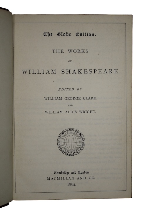 The Globe Edition of Shakespeare's works, finely bound by MacLehose, edited by English classical scholars William George Clark (1821 – 1878) and William Aldis Wright (1831 – 1914). First published in nine volumes as The Cambridge Shakespeare between 1863 and 1866, this 1864 collection, on fine India paper, removes the extensive footnotes and critical apparatus of the individual volumes.