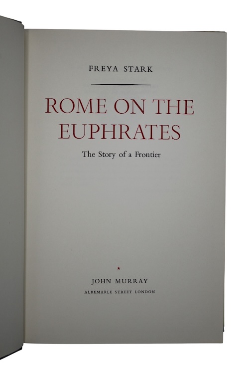 The first edition, in original dust-wrapper, of historian and travel writer Dame Freya Madeline Stark's (1893 – 1993) acclaimed account of her travels along the ancient river Euphrates in Turkey. Both travelogue and historiography, Stark chose to contrast her autobiographical notes with an insightful and revealing study on the Eastern Roman Empire, recalling 800 years of - often futile - warfare across the region claimed as 'Augusta Euphrantentis'.